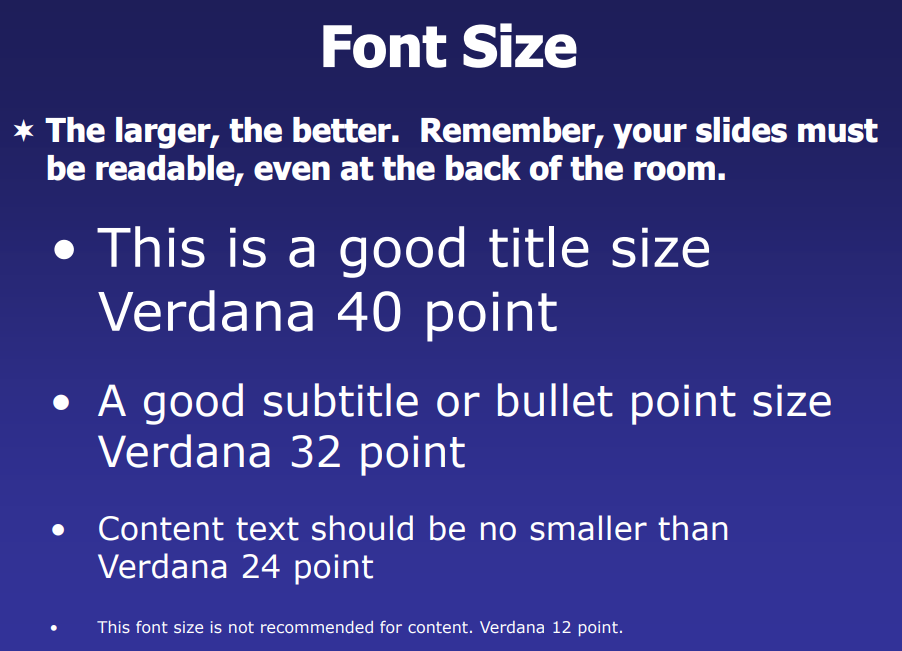 should be at least 40pt and body text - 24 pt or above. And make sure you use high-contrast