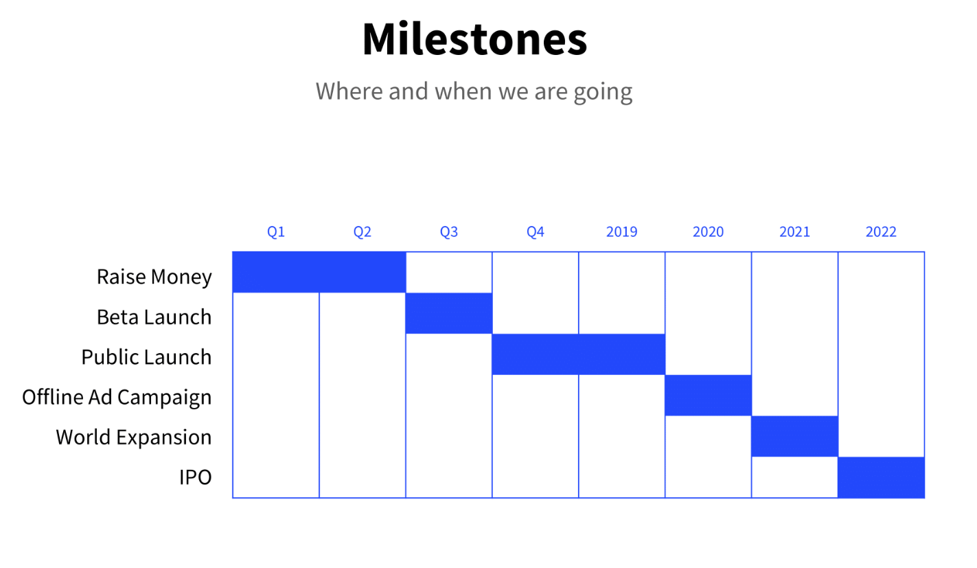 What is the timeline of your project, and where are you at the moment? How long will it take to reach your goals, and what do you need to succeed? Describe your current position in the market to find key boosting ideas. Also, don't forget to include at least an approximate timeline relevant to your project. The fact is that investors always want to know when their money and risks are converted into profit.