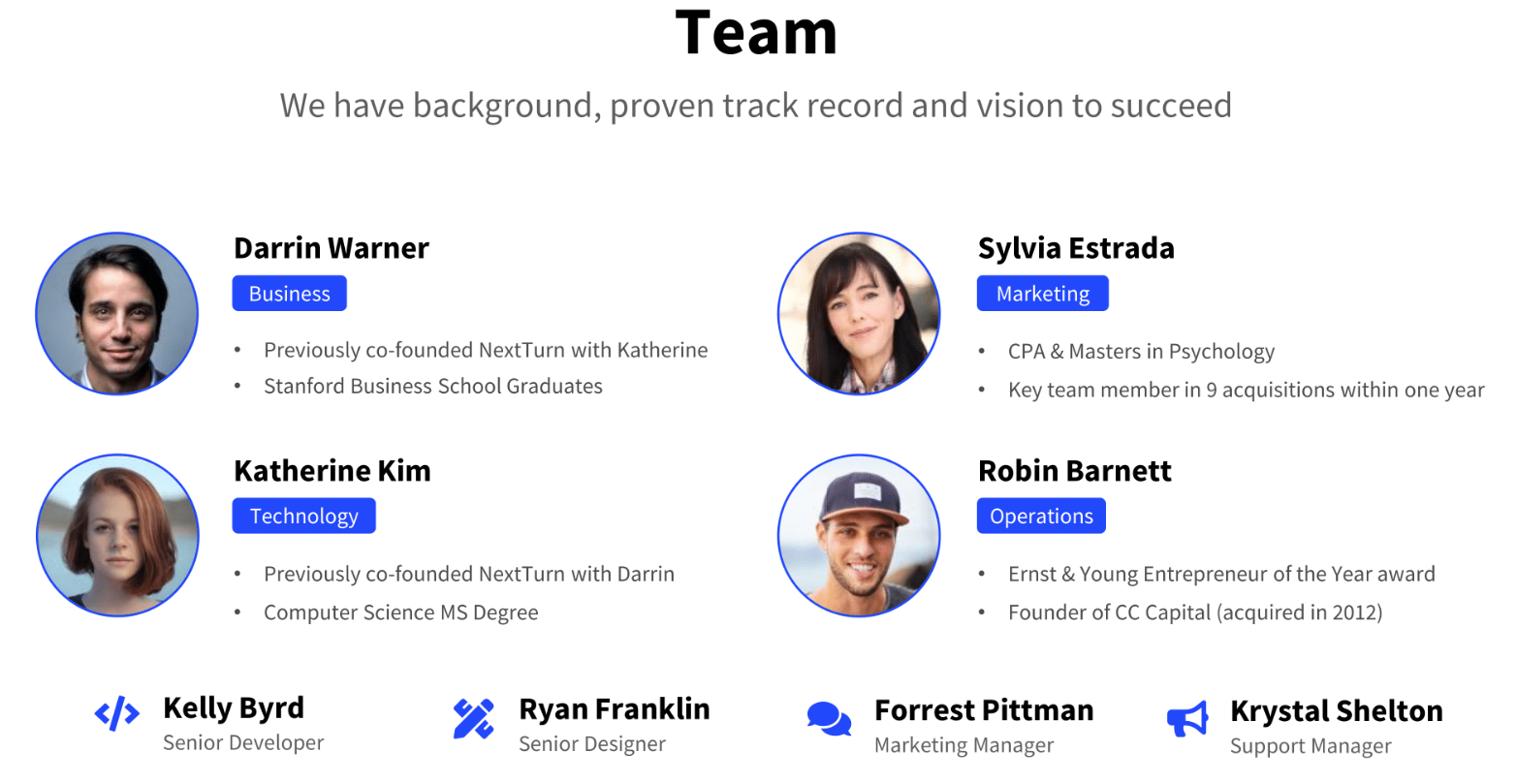 A good team is a foundation for any company. Introduce the other people on the project with you and their key roles. Show off their credentials and relevant experience. Create slides with photos or video demonstrations of each employee. And you should also focus on the importance of people in your project. Any investor will be interested in your ideas if you show that your team can be trusted.