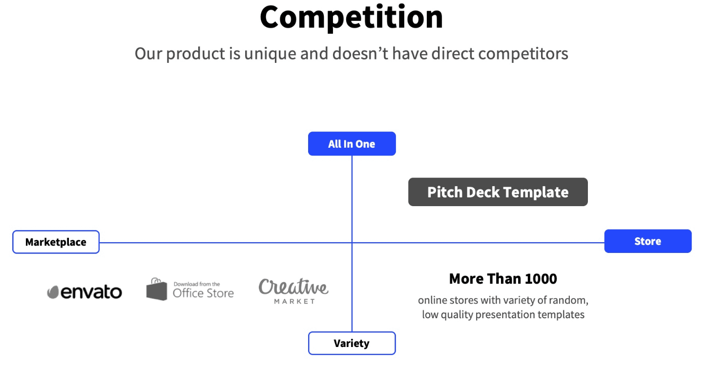 Where do you stand in the overall market space? Describe all competitors in your business sector and explain why you are different. You can even check some kool visuals to order for the pitch deck slides to set the stage for attracting investors. But do not forget that people with money always need direct answers. Be direct and honest. How are you going to attract customers? Are you going to offer the best product or service on the market? Will you use a personal brand, aggressive marketing, dumping, or commercial tricks? Answer all these questions, and your pitch deck will be perfect.