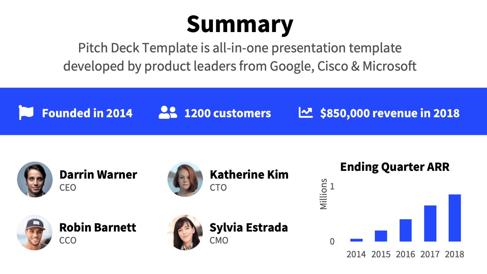 It's time for the final part of your pitch deck. Briefly focus on your business's key nuances and perspectives and form a call to action. Perhaps you should use statistics to motivate investors or focus on the benefits that will become a springboard for economic growth. In any case, you need to interest potential investors by showing them the company's growth prospects.