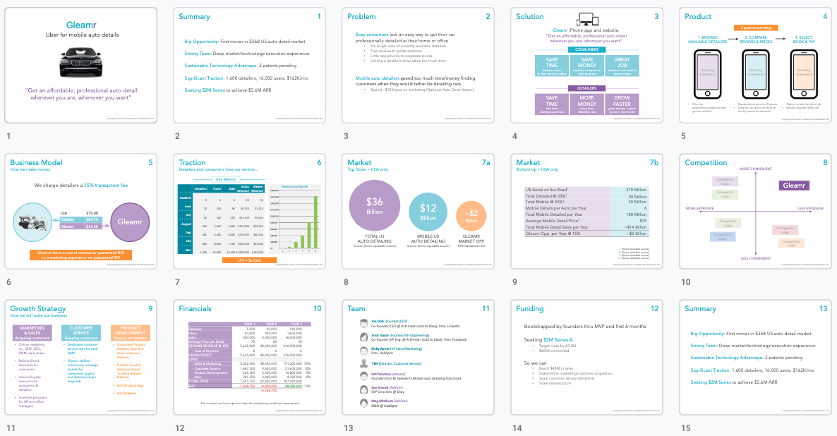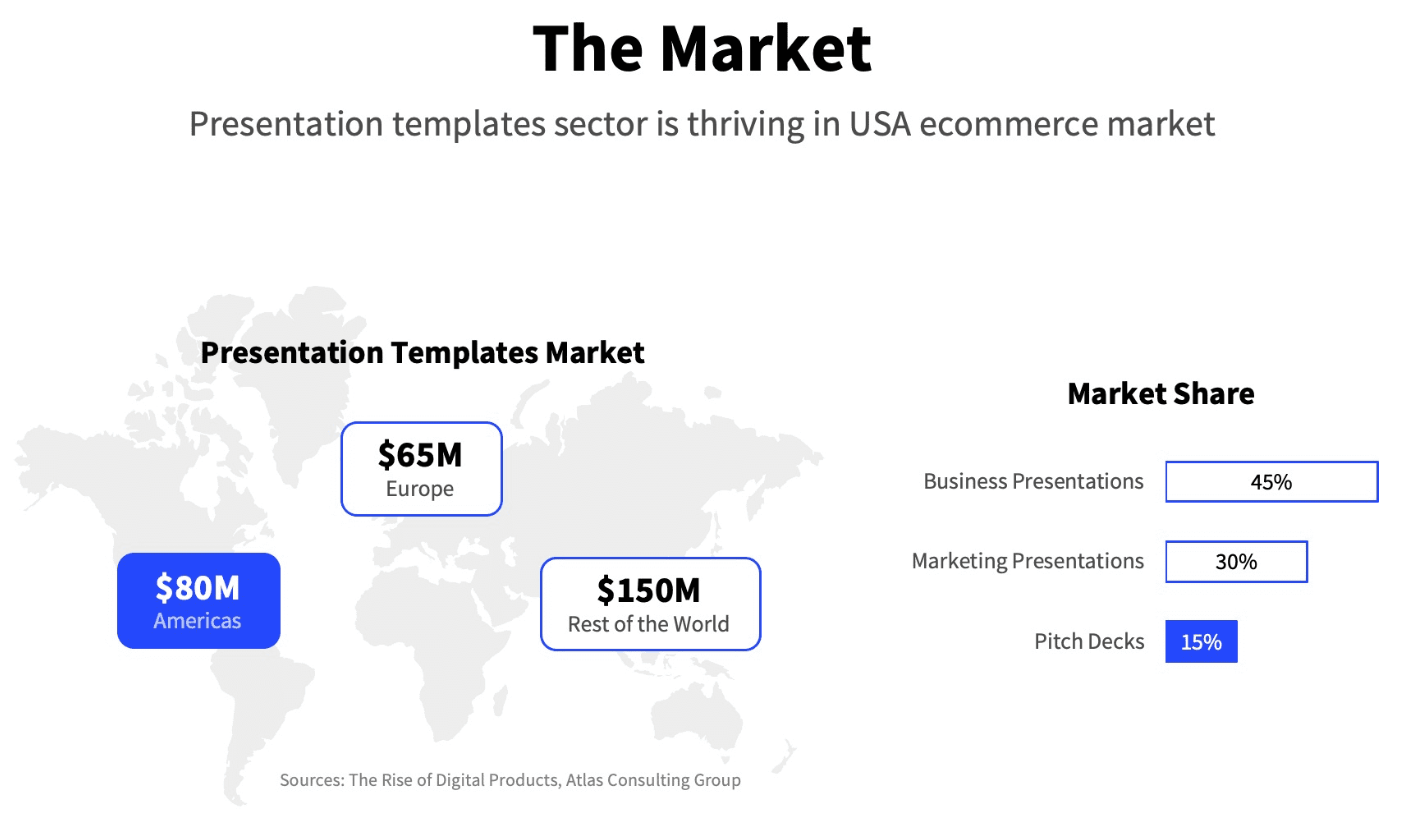 This presentation pitch is usually aimed at partners or customers. Your key goal is to present your product or service. As a rule, you will need 5 to 10 slides to describe the value of your offer and encourage people to take certain actions. In some way, your set will be "independent," and people should not need further analysis. Instead, use direct language and obvious descriptions of the benefits of working with you.